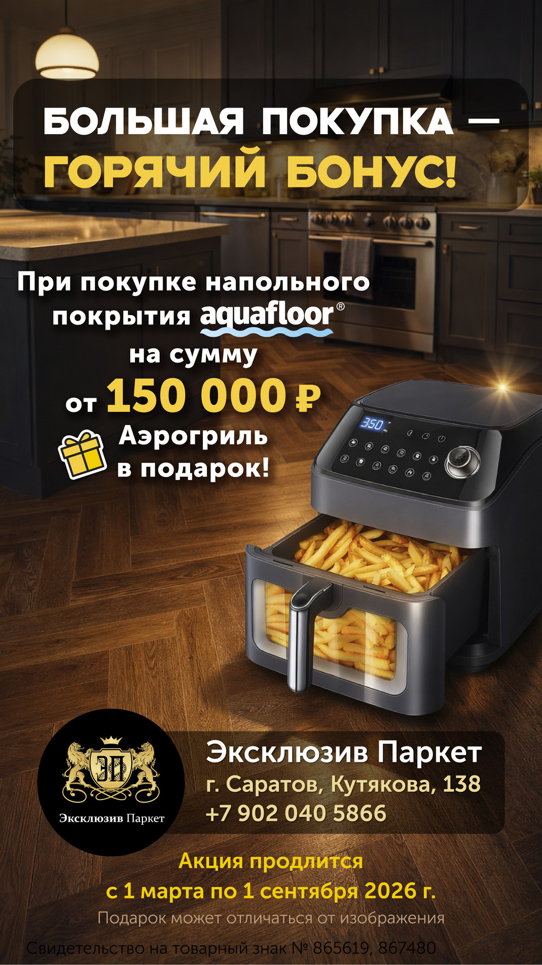 👉 При покупке любого напольного покрытия Aquafloor на сумму от 150 тыс. руб., мы дарим новый аэрогриль в подарок*.