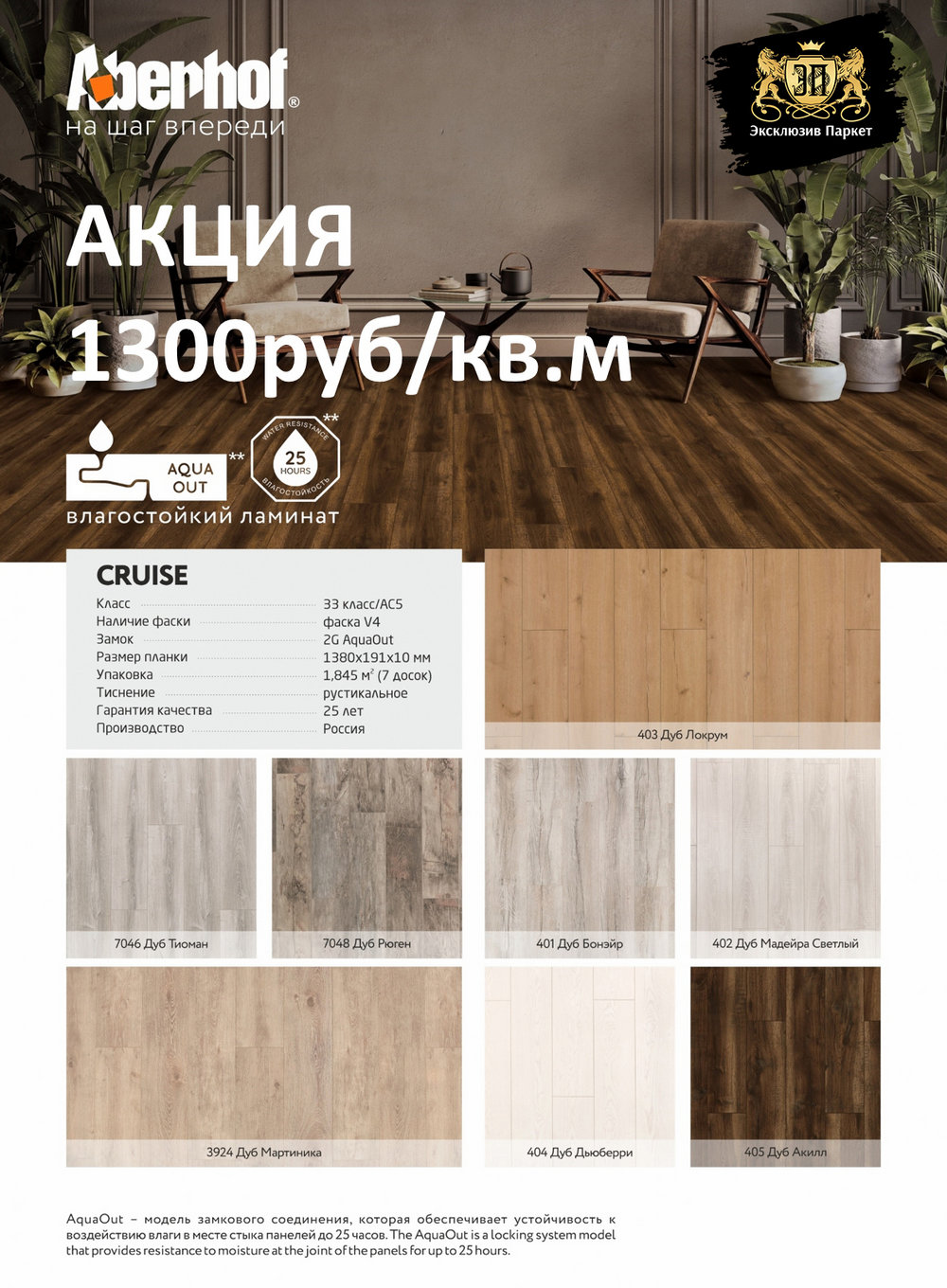 Акция на влагостойкий ламинат Aberhof Cruise 1300 руб/м2 Акция на влагостойкий ламинат Aberhof Cruise - 1300 руб/м2РАСПРОДАЖА * SALE * АКЦИЯ 👉 Акция на 8 декоров до конца 2025 года, спец цена 1300 руб за кв.м. *Акция действует только на остаток на складе! КУПИТЬ В 1 КЛИК 2-12-2025, 18:13 Наши новости / Акции, распродажи, скидки 102