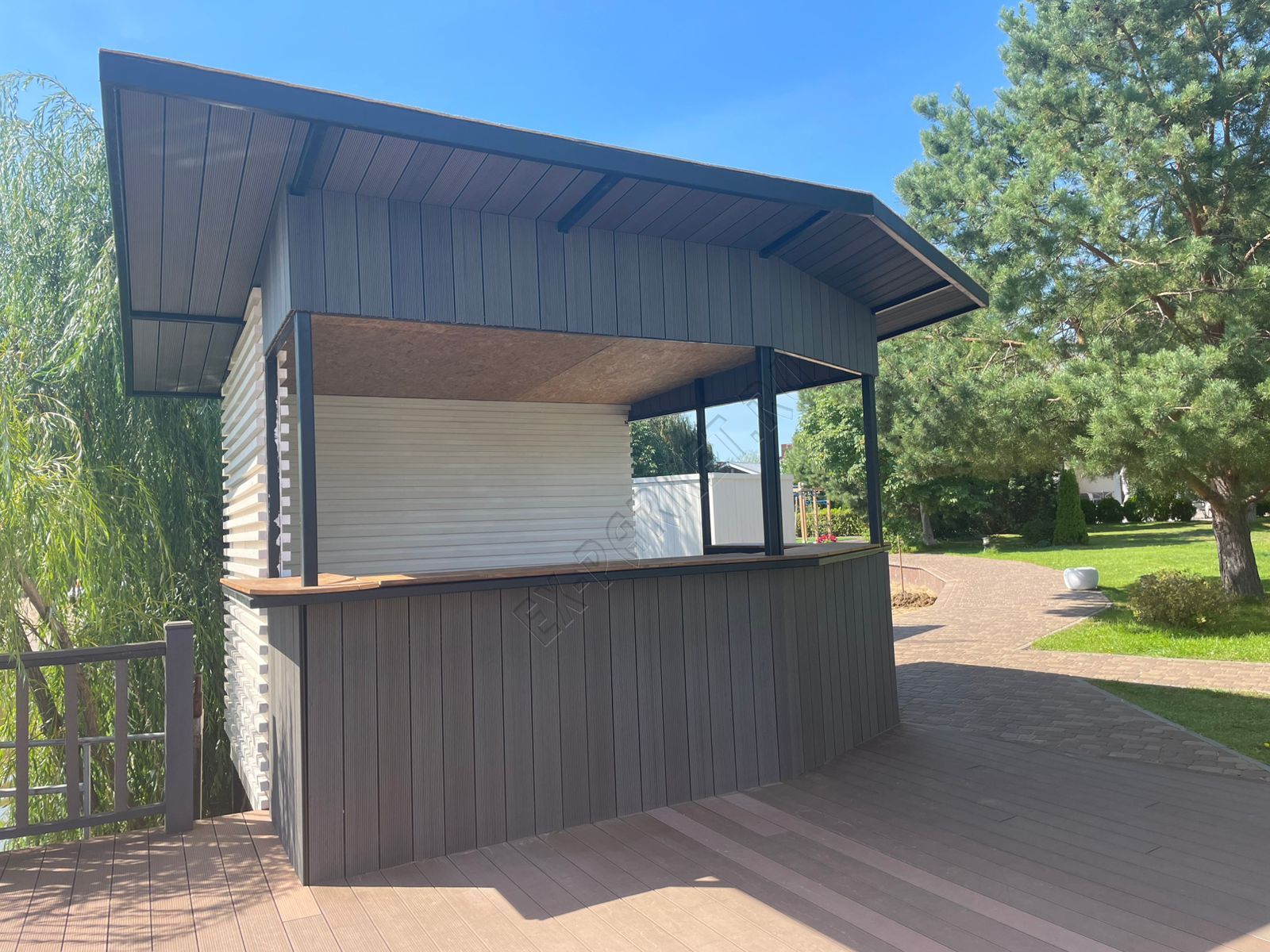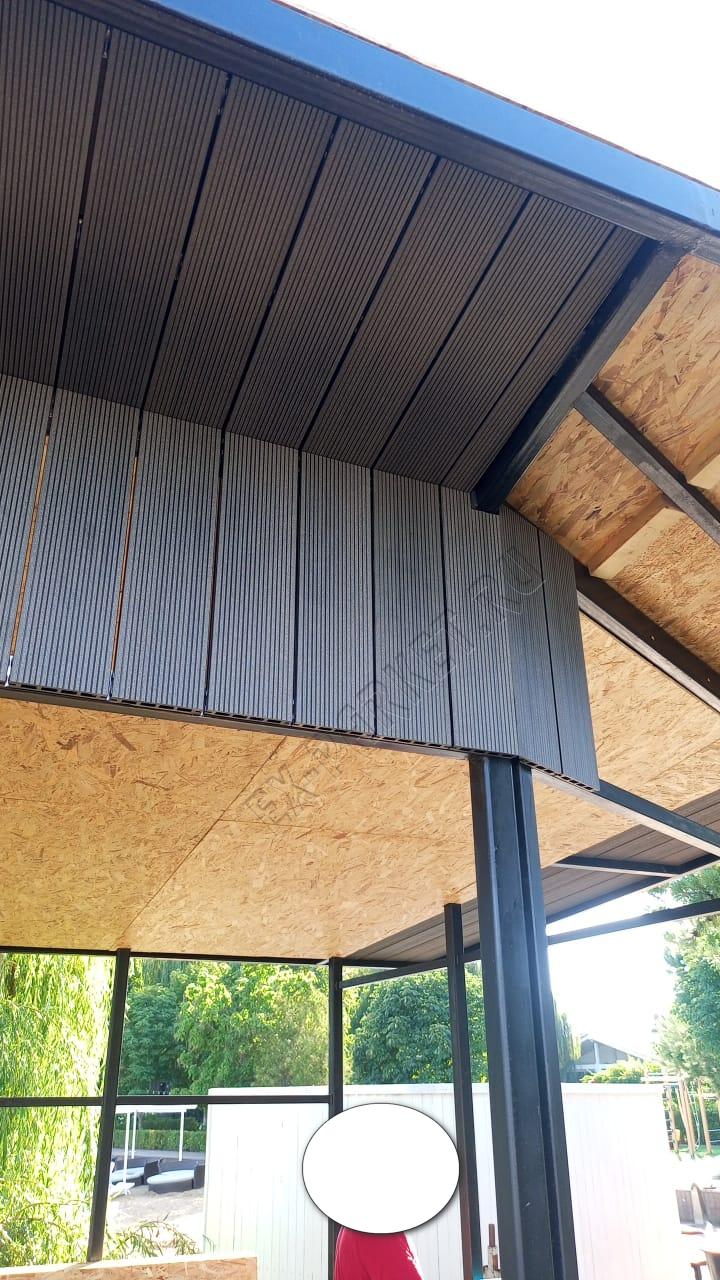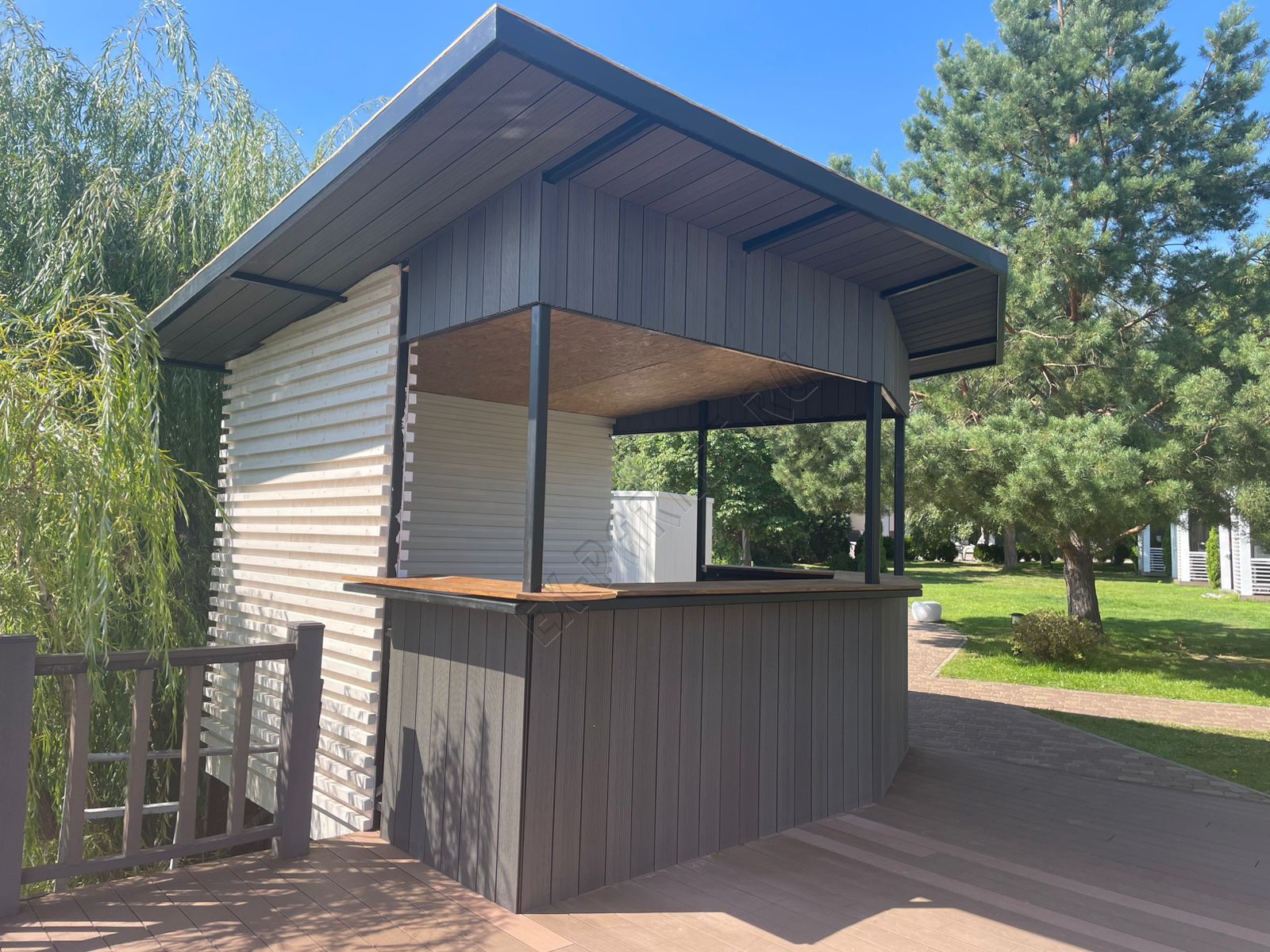 🍨 Создали дополнительное пространство для напитков и мороженного в усадьбе "Волжино" из террасной доски Good Cover цвет графит (2025 год). Длины использовали 6 метровые, 4-х метровые, кляймер Good Cover 22/5, крышу изготовили так же из террасной доски толщиной 22мм. Угловые элементы выполнены без использование декоративного уголка, что сразу показывает высокий уровень мастерства мастера.