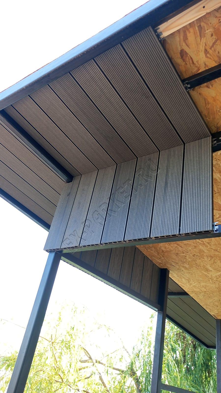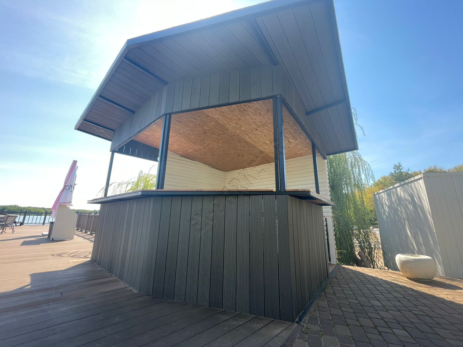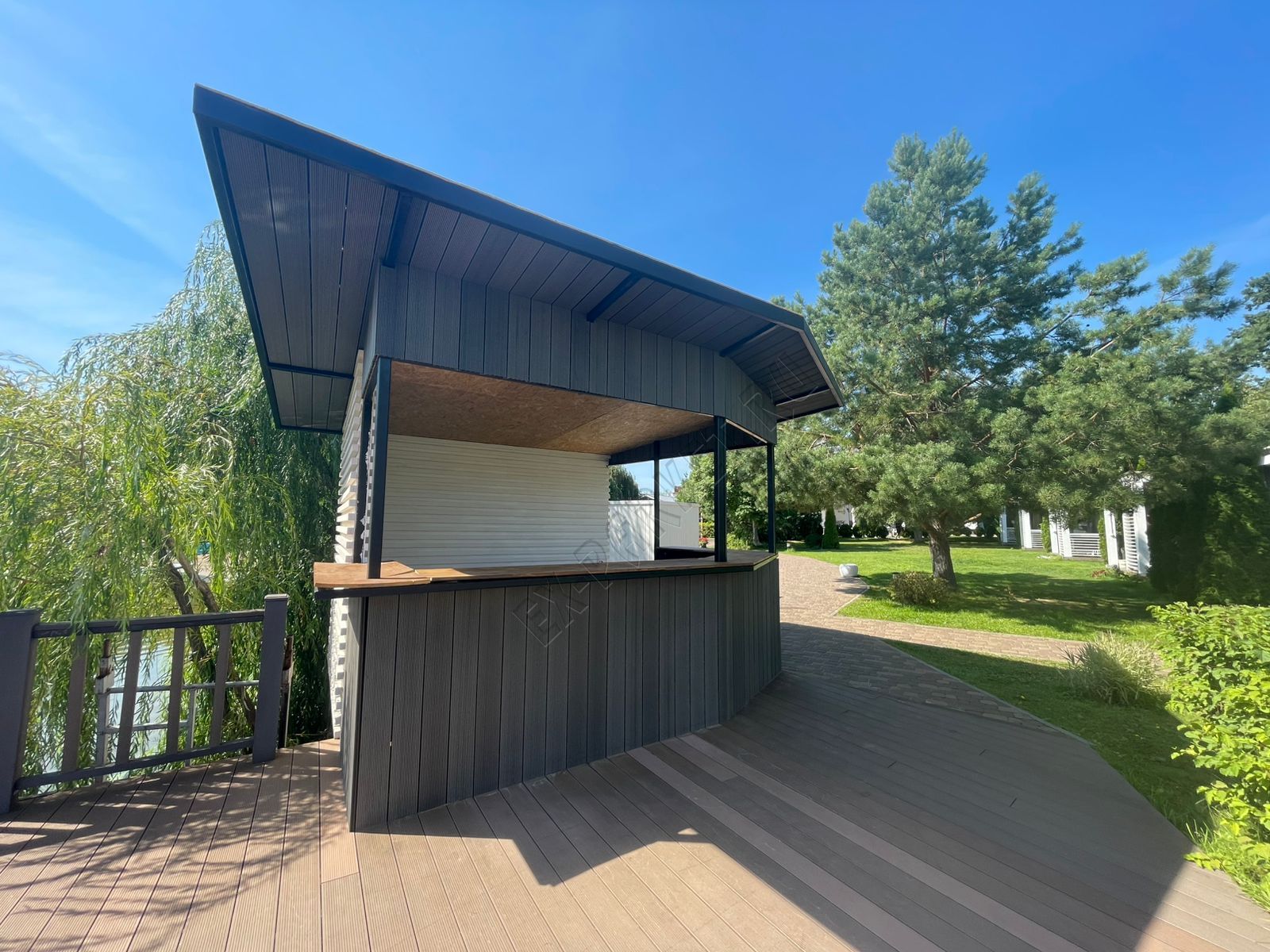 🍨 Создали дополнительное пространство для напитков и мороженного в усадьбе "Волжино" из террасной доски Good Cover цвет графит (2025 год). Длины использовали 6 метровые, 4-х метровые, кляймер Good Cover 22/5, крышу изготовили так же из террасной доски толщиной 22мм. Угловые элементы выполнены без использование декоративного уголка, что сразу показывает высокий уровень мастерства мастера.
