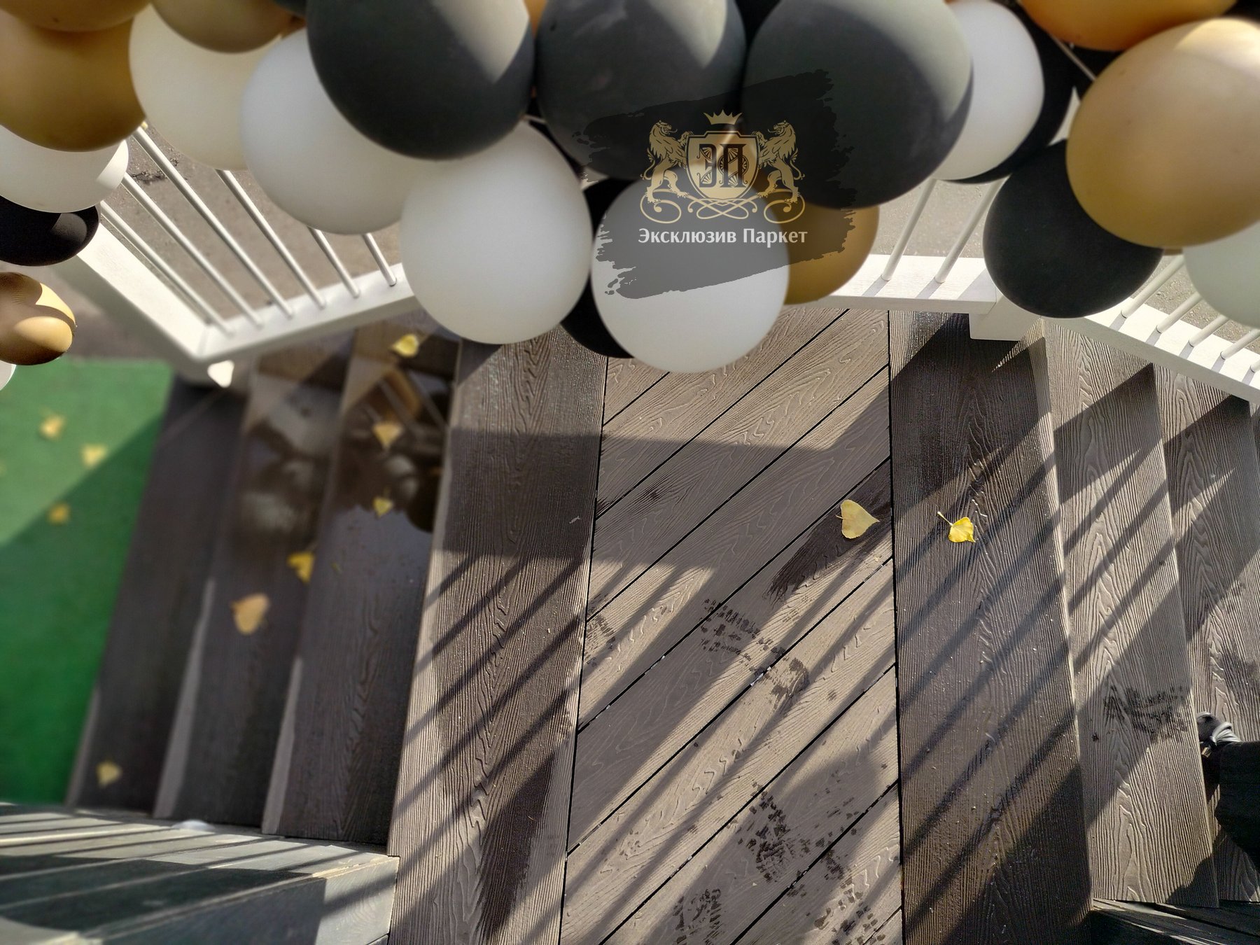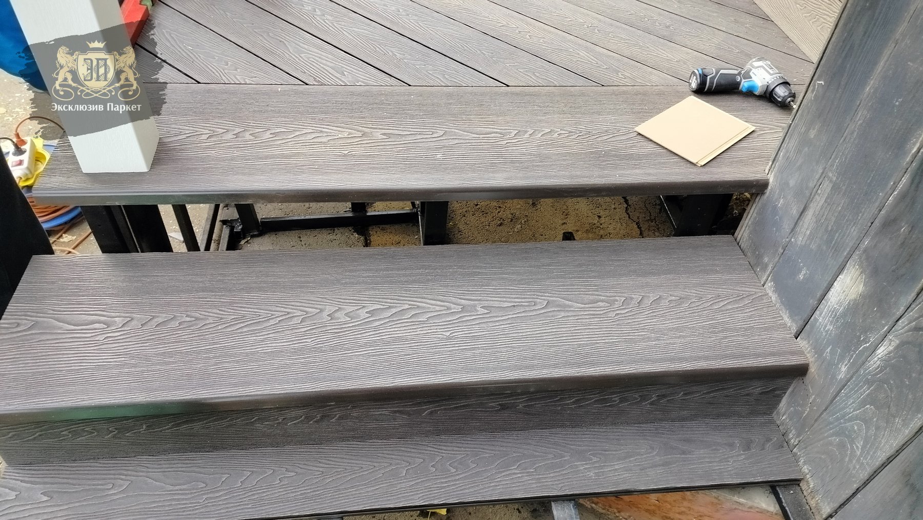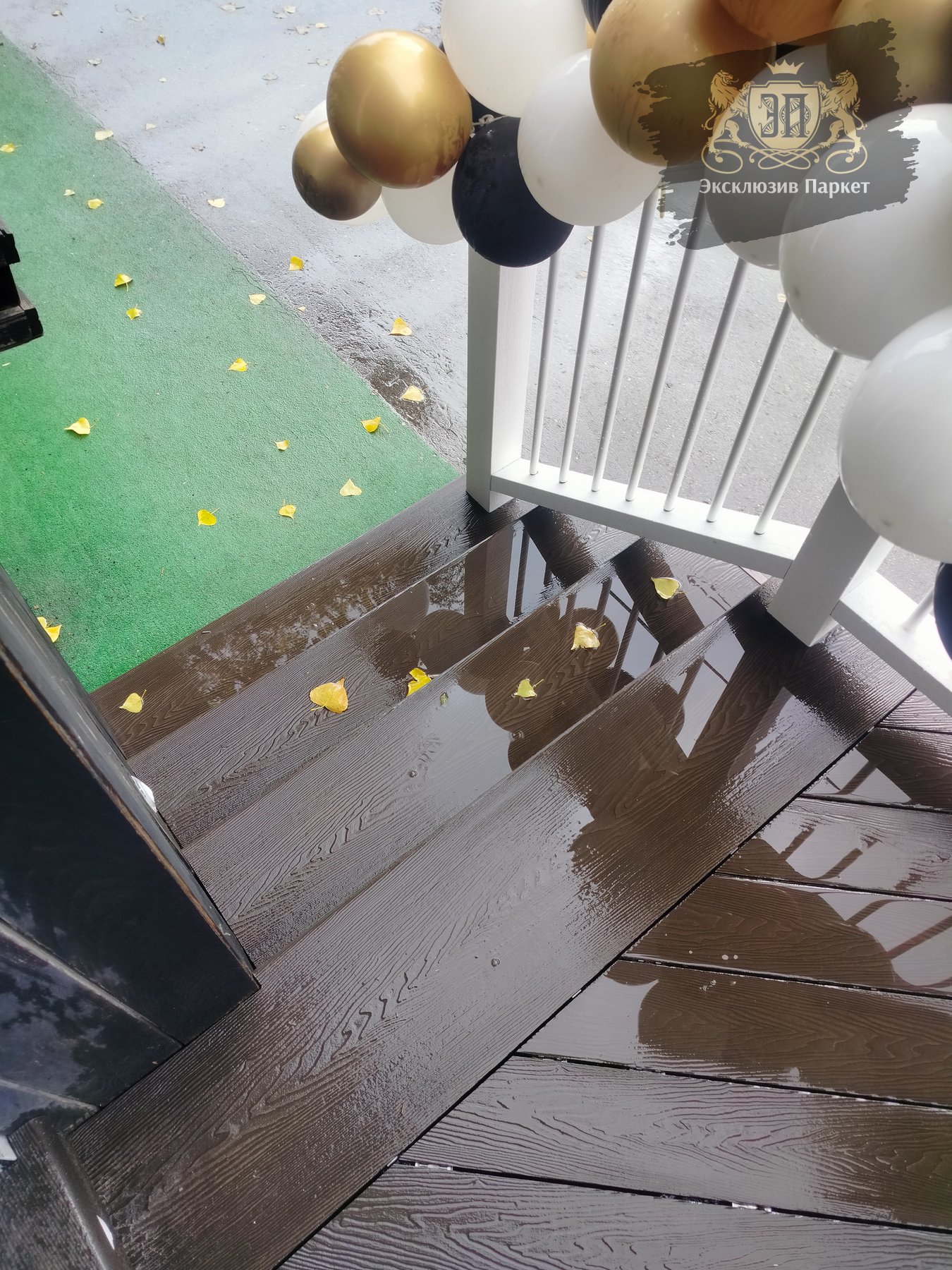 • Подступенники и площадка: Смонтированы из террасной доски ДПК Good Cover 3D 140х22х3000мм, цвет "венге".