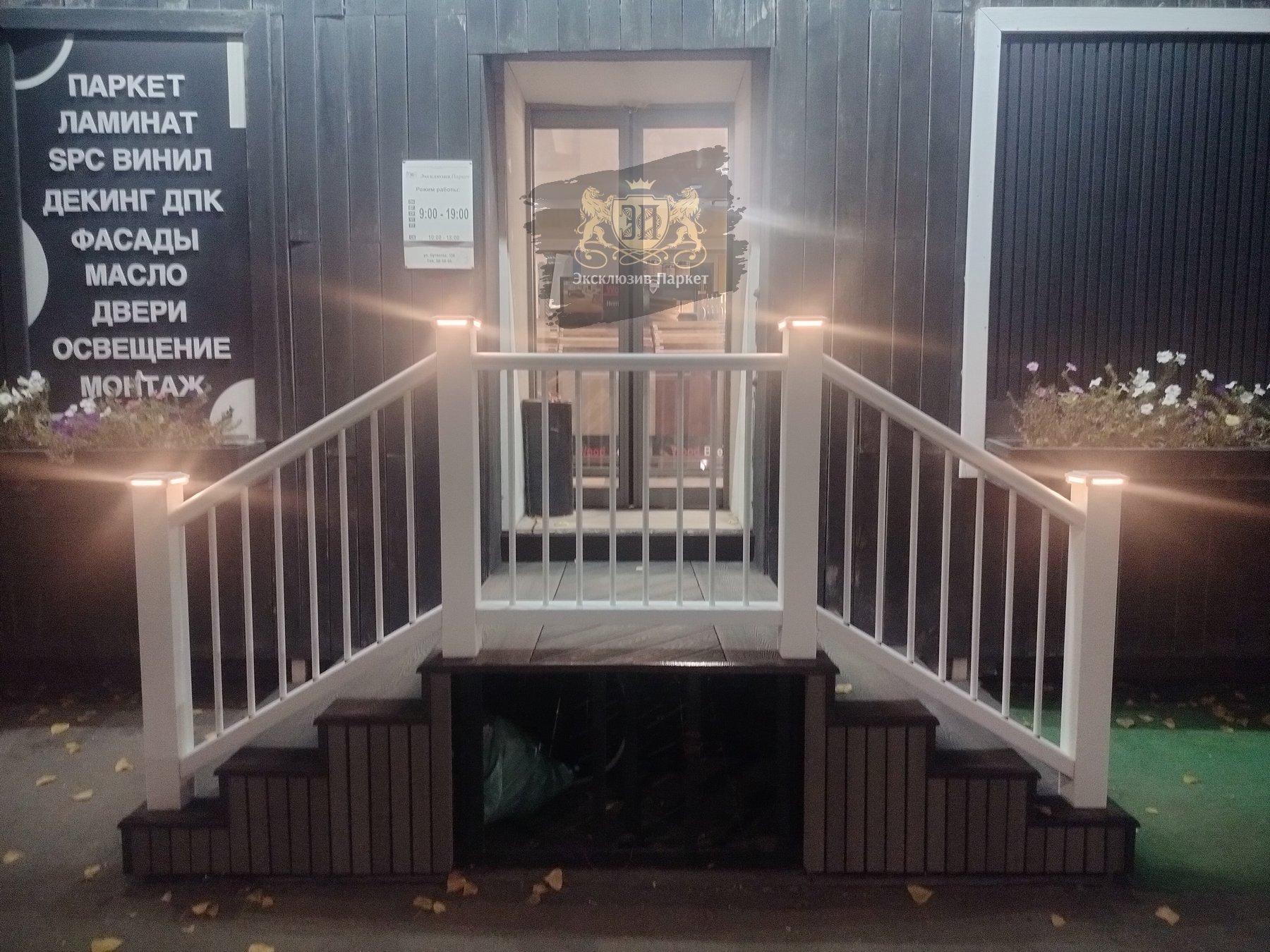 Входная группа, лестница из декинга Good Cover 3D и ограждения ДПК Woodvex