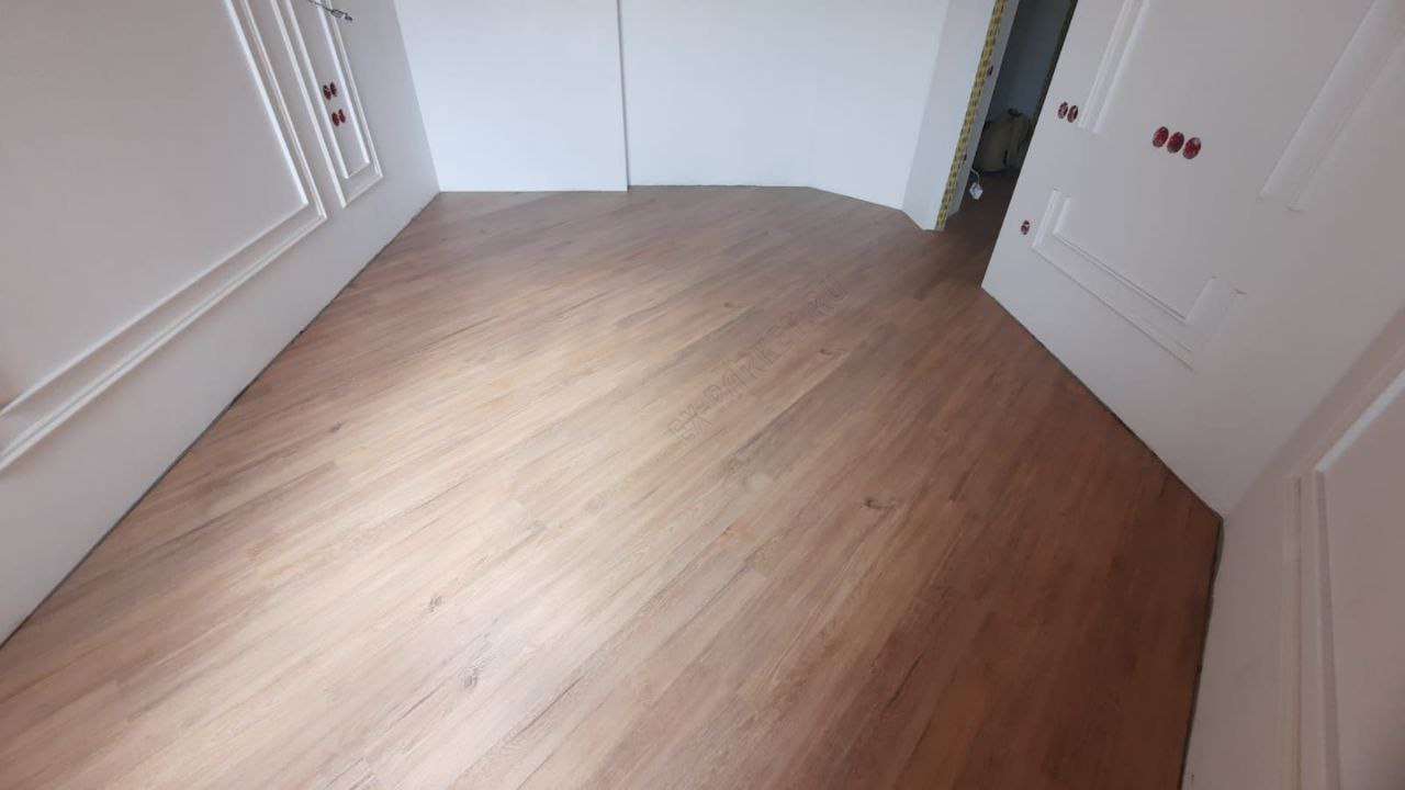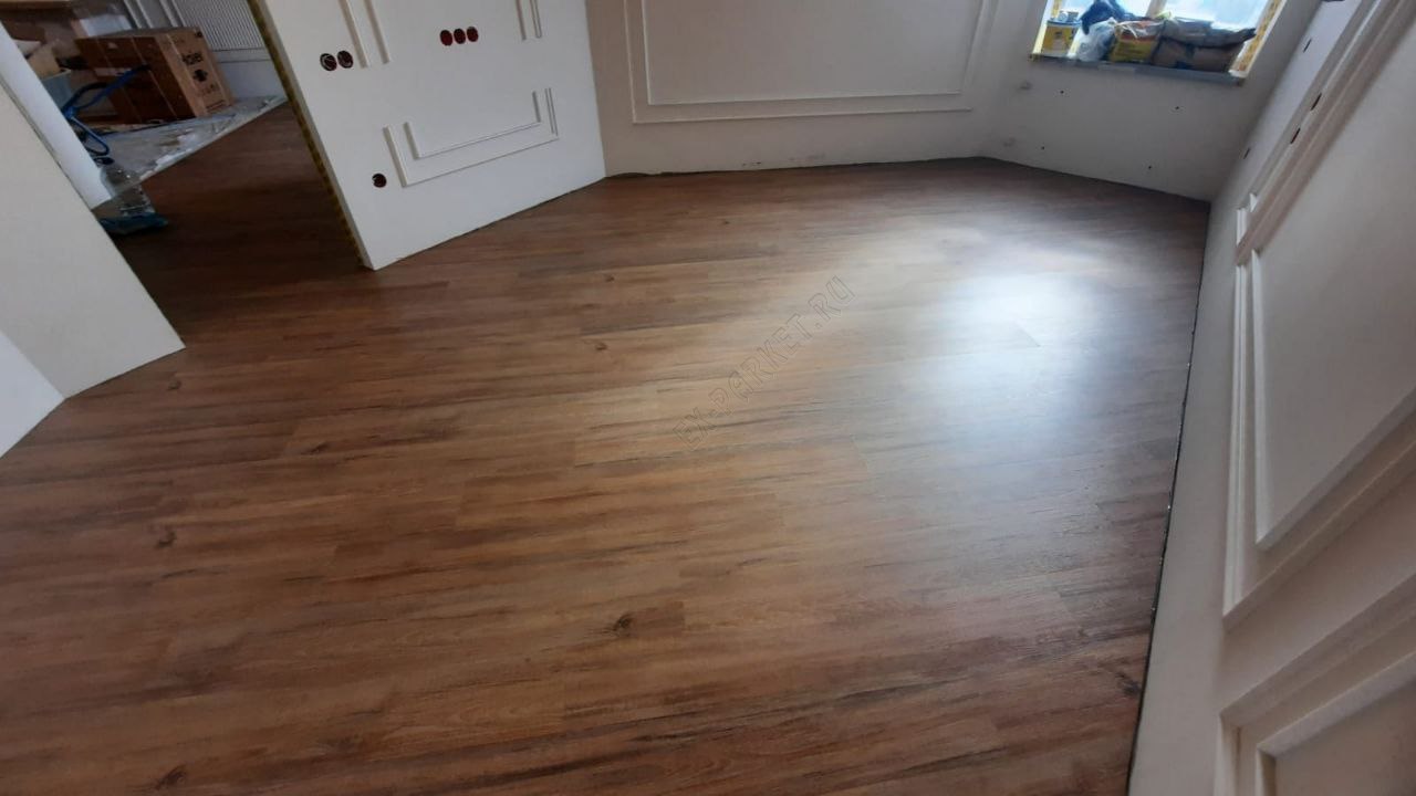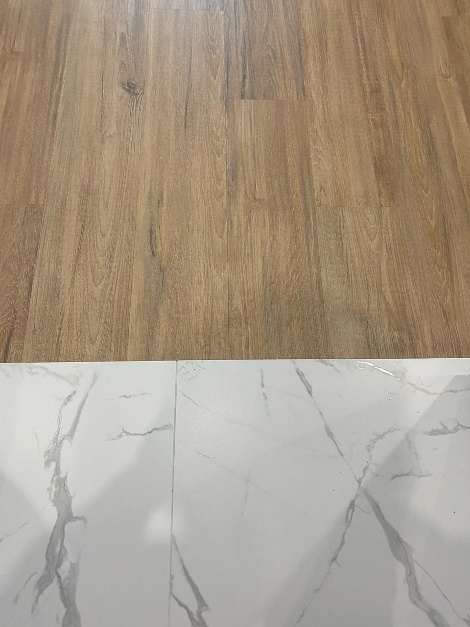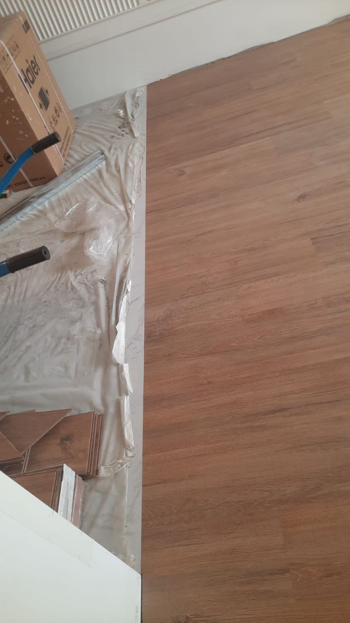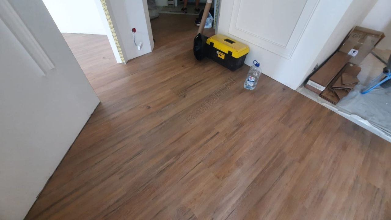 ✋ Несмотря на наличие замковой системы, монтаж производился клеевым способом. Это профессиональное решение, которое даёт владельцу ряд неоспоримых преимуществ: пол становится монолитным, исключается малейший люфт или «барабанный» эффект при ходьбе, а также появляется возможность выполнить идеально ровный стык с плиткой без использования порогов.