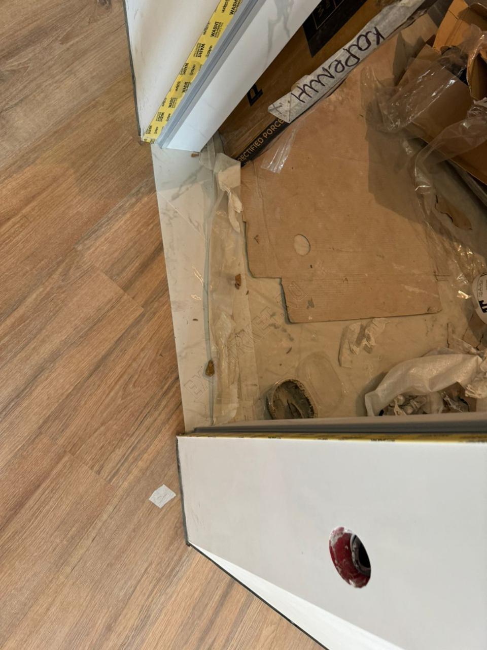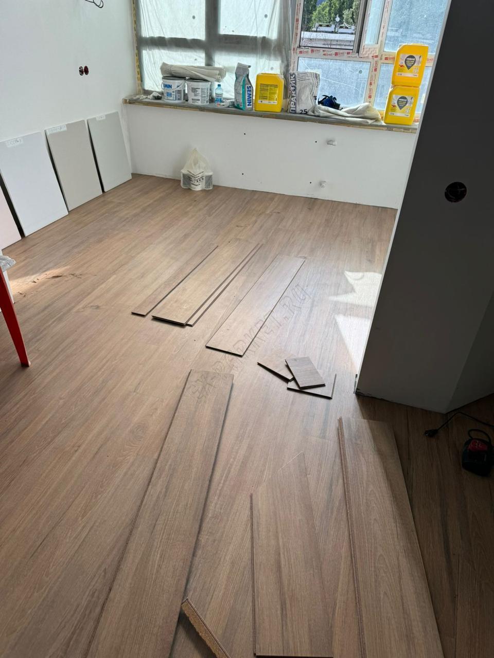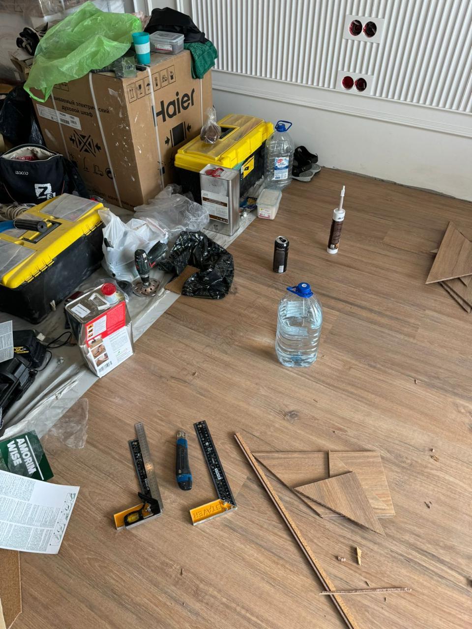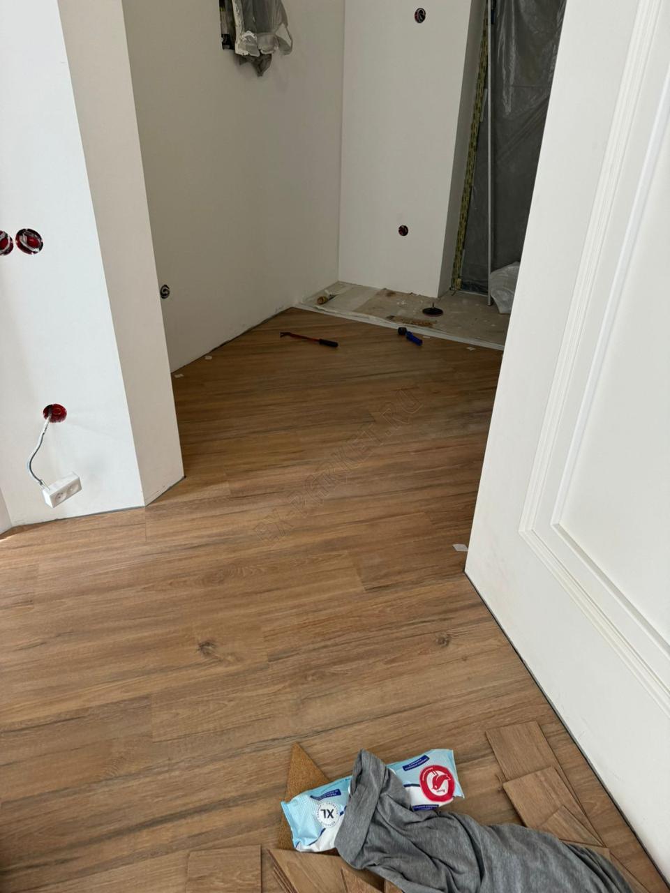 ✋ Несмотря на наличие замковой системы, монтаж производился клеевым способом. Это профессиональное решение, которое даёт владельцу ряд неоспоримых преимуществ: пол становится монолитным, исключается малейший люфт или «барабанный» эффект при ходьбе, а также появляется возможность выполнить идеально ровный стык с плиткой без использования порогов.